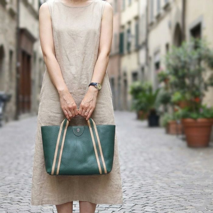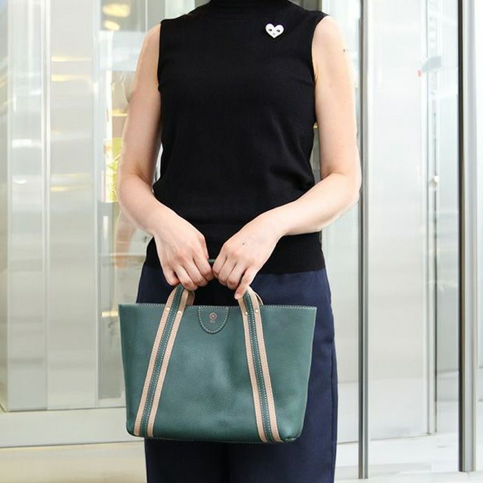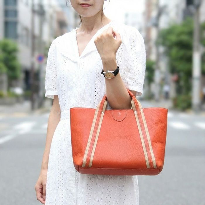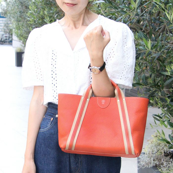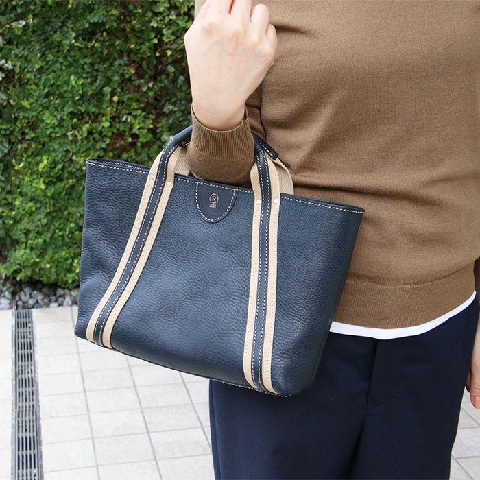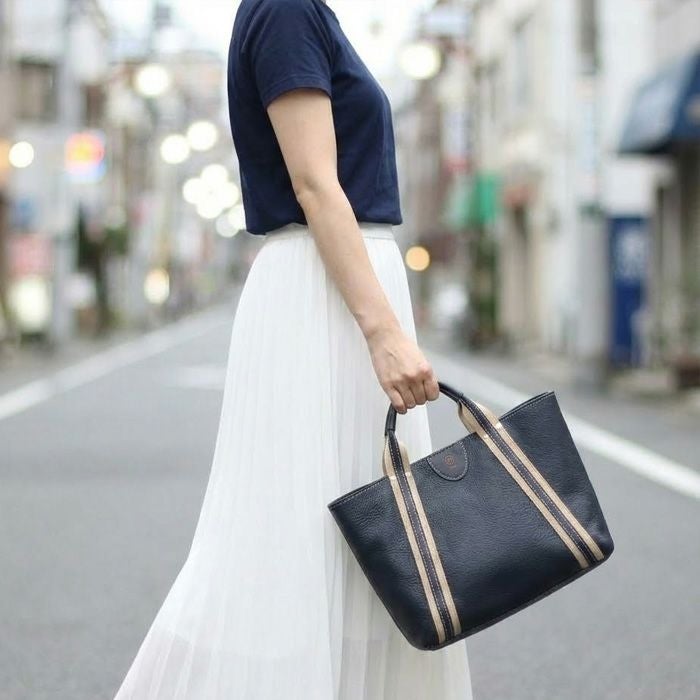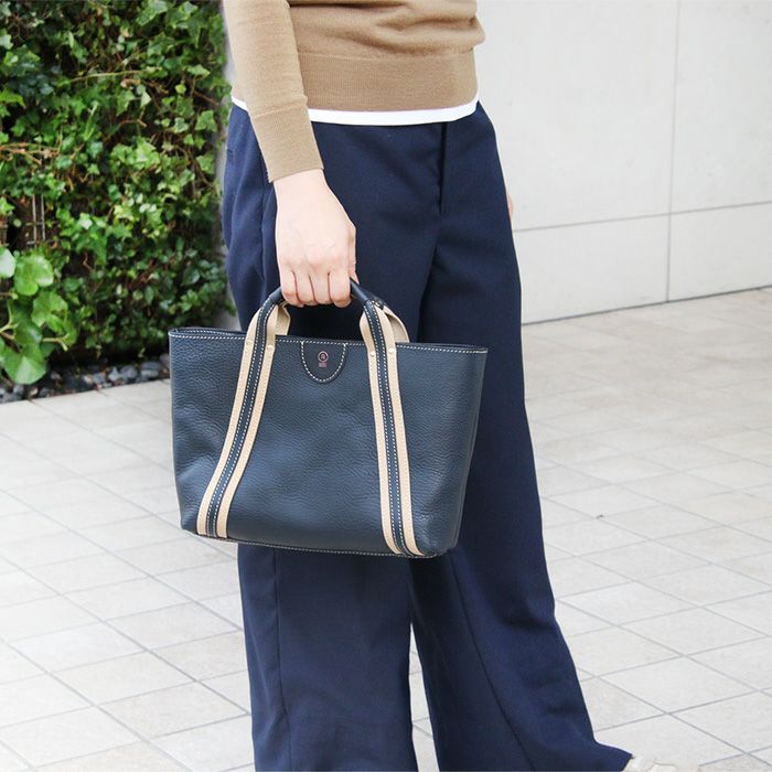 本体シルエットを美しく保つための機能美とデザイン性を持たせたテープ×レザーの持ち手はアクティブに使っても安心の作りとなっています。