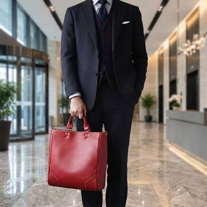 カジュアルにも持てるビジネスバッグとしてPORCO ROSSOの中でも人気の高いバーティカルビジネストート。縦長の紙袋をデザインのヒントに、当初はサイズや重量も少し大きめで設計していました。この度、その大きめバージョンをリリース!