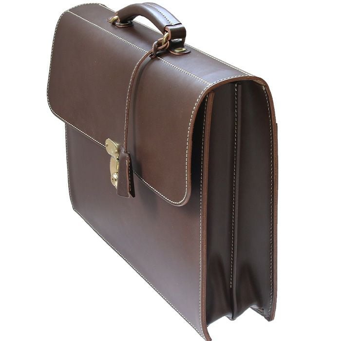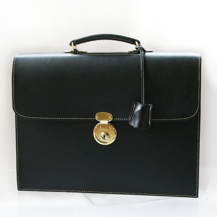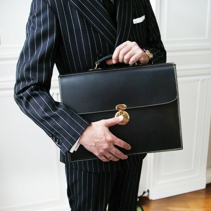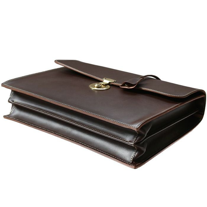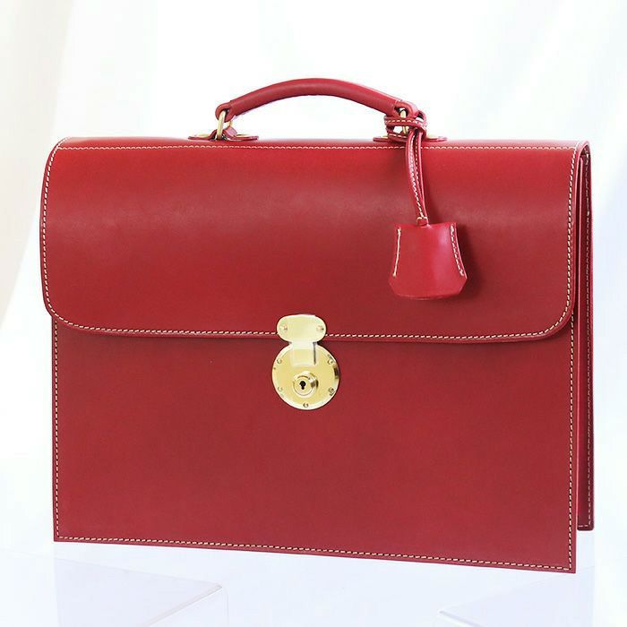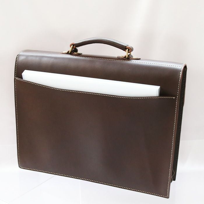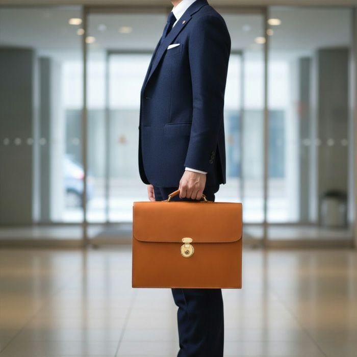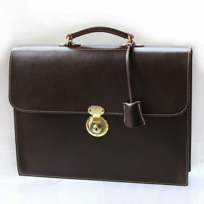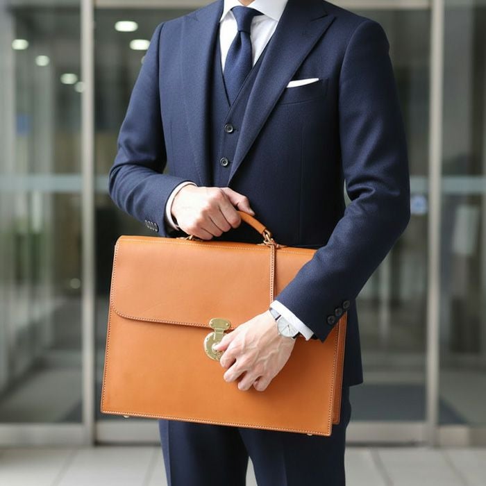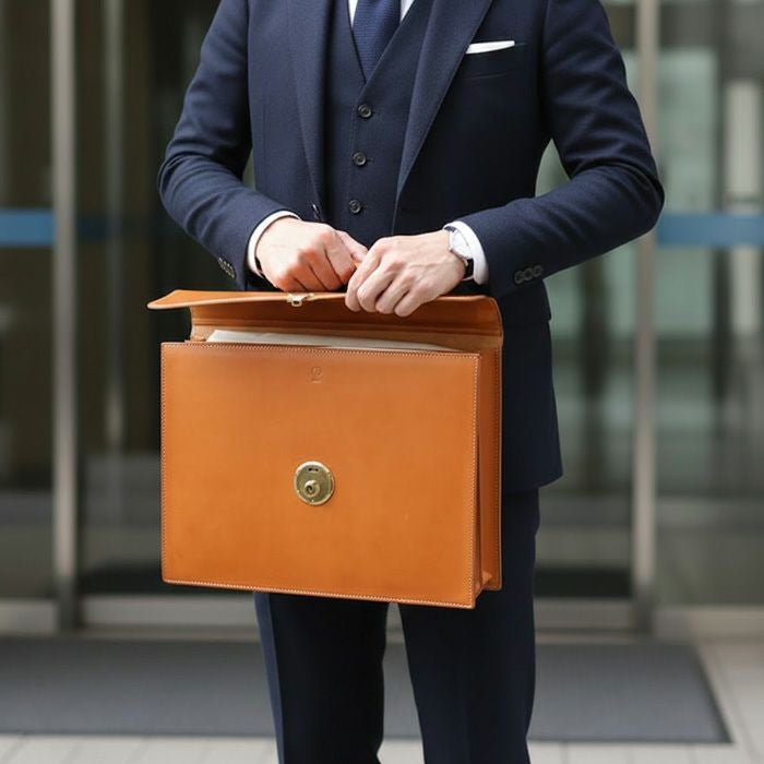高級感のある重厚な雰囲気で、大人の貫録を漂わせるブリーフケース。 カッチリとした雰囲気で魅せる、端整なブリーフケースをリリース。 本革の美しさが盤面一杯に広がる、豪華な魅力が満載の一品。握り心地の良いハンドルをグッと握りしめ、リッチ顔のビジネス鞄とオフィス街を歩く心地良さは絶品もの。堅牢かつ重厚な錠前の表情は、大人の余裕を感じさせます。 ビジネスシーンにおいて「良い鞄をお持ちですね」と話題に上がること間違いなしの、こだわりのビジネスアイテムです。 PORCO ROSSOでは初となる錠前鞄。デザインは王道の1本手で半かぶせの2部屋仕立てにしています。 横幅が38cmあるため、A4ファイルもすっきり納まります。見た目よりも軽く、錠前の閉め辛さを軽減させるために本体前面には樹脂板を仕込んでいます。 SPEC 錠前とキークロシェット 中央パーツを下げることで錠前を開けることが出来ます。また、鍵はキークロシェットの中に収納されています。キークロシェットはビジネスシーンにも違和感なく馴染む形状にデザインしています。 外観 王道的な安心感のあるビジネスバッグ。錠前ならではの表情が、鞄に良いアクセントを添えています。 側面 底部分には、あえて折りジワをつけて、収縮する可動域を保ちつつデザインの一部に仕上げています。 底面 地面に置いた際も安定感がある幅広の底面。 持ち手 ビジネス鞄としてスタンダードな一本手の持ち手。革を巻いて握り心地の良いハンドルに仕上げています。 背面 A4サイズの書類が収まるサイズの背面ポケット。書類が取り出し易いように、なだらかなカッティングを施しています。 開けた様子 かぶせ蓋を開いた様子。前面中央に小さくブランドロゴが付いています。内部は樹脂版で仕切られた2部屋仕立てで、底には底板が付いています。 使用例 ビジネスに必要なA4ファイル等がすっきり納まるサイズ感。 収納した物 A4ノートカバー(pr-nt-1-a4)、ペンケース(pr-pn-5)、長財布(pr-wa-12)、A4ファイル、通帳カバー(pr-va-2)、手帳カバー(pr-sy-3-m)、を収納しました。 COLOR キャメル チョコ レッド ブラック SIZE サイズ(外寸) 横 縦 マチ 約38cm 約29cm 約10cm 重さ:約1,280g 【仕様変更も承っております】 こちらの商品で可能な仕様変更 ・例1:ステッチの糸色を黒に変更【加工料:無料】※ブラックのみ可能 ・例2:ポケット取り付け【加工料:有料】 ※仕様を変更した商品につきましては、返品をお受けすることができません。あらかじめご了承くださいませ。 ⇒仕様変更についてはこちら 【文字制限】※重要 ・文字数は10文字までOK ・アルファベット大文字のみOK ・ドット(.)は1回だけ使えます。 ・スペース(空白)、アンド(&)、アット(@) は各1回だけ使えます。 ・同じ母音は3文字まで、同じ子音は2文字まで使えます。 (※母音はA・I・U・E・O 子音はそれ以外のアルファベット) 【文字フォント見本】 ゴールドの箔押し。 文字サイズ:縦4~5mm 【注意事項】 ※名入れをした商品の返品・交換はできません。 ※名入れ代金(当ページ)を未購入、また通信欄への文字の記入がない場合、ご注文は保留とさせていただきます。 通常の納期でお届けができなくなりますのでご注意下さい。 ※文字数や文字の組み合わせの都合などで刻印が難しい場合は、メールかお電話でご相談させていただきます。 メールでのお問い合わせ≫ PORCO ROSSO ポルコロッソについて こだわりのオリジナルレザー カスタマイズについて 返品・交換について 商品の品質につきましては、万全を期しておりますが、万一不良・破損などがございましたら、商品到着後8日以内にお知らせください。その他返品・交換につきましても、8日以内、未使用に限り可能です。 詳しくはこちら レビューを書く