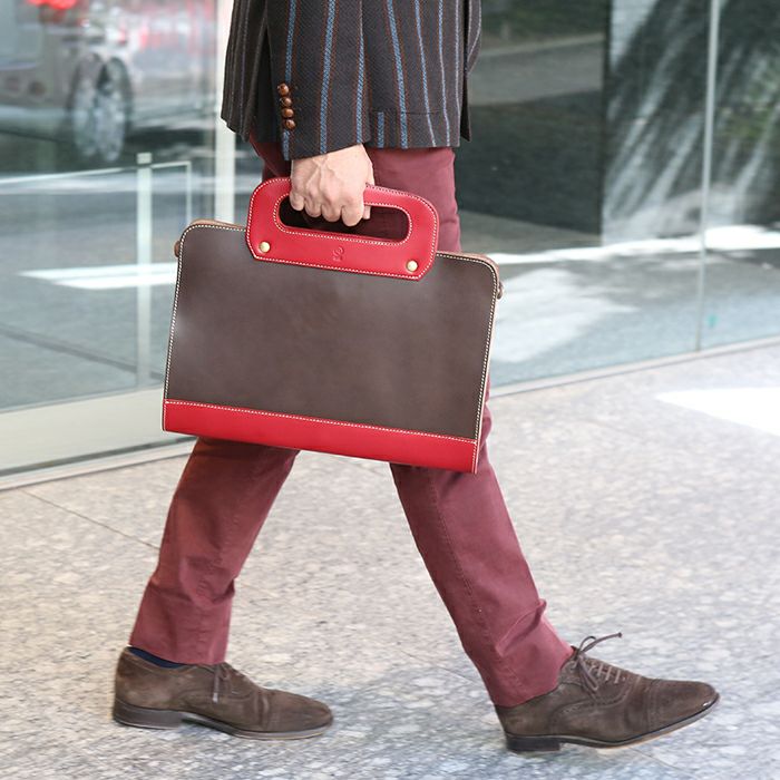 外観 シンプルフェイスのPCバッグ。持ち手は手で持った時に