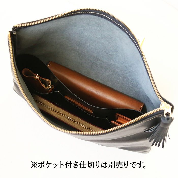 上質な本革を手のひらいっぱいで堪能できる、ソフトレザーのクラッチバッグ。何年使っても飽きが来ないシンプルなデザインに、引き手のタッセルが華やかさを添えます。
