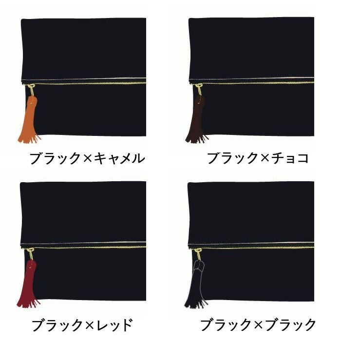 pr-cl-4(リバーシブルクラッチバッグ)をファスナー仕様にリモデルしました。リバーシブルクラッチバッグ同様に本体は至ってシンプルな袋状に仕上げ、その分、ファスナーの引き手には存在感のあるビッグタッセルを取り付けました。