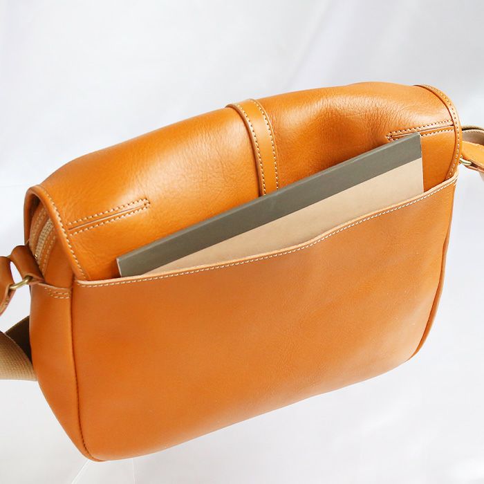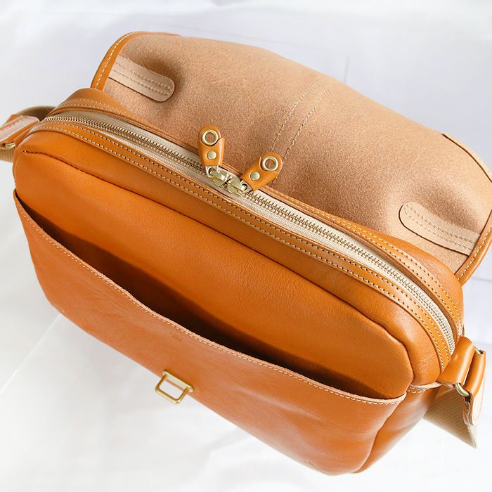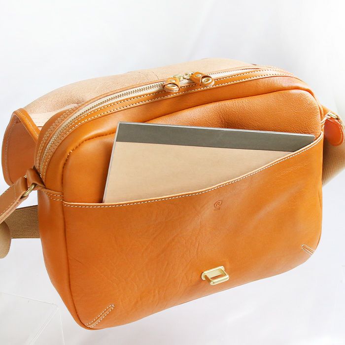 立体的な総かぶせのフラップが特徴的。A4用紙サイズが綺麗に収まる本体は防犯も兼ねたファスナー仕様。収納の工夫など、お客様の生の声をもとに作っているので使いやすさも際立っています!