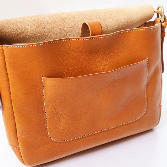存在感のある一枚革のかぶせが目をひきます。かぶせを開くと本体前面にポケットが取り付けられているので、携帯電話などの携行品を入れておくのに重宝します。