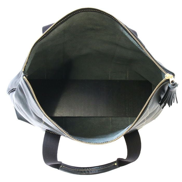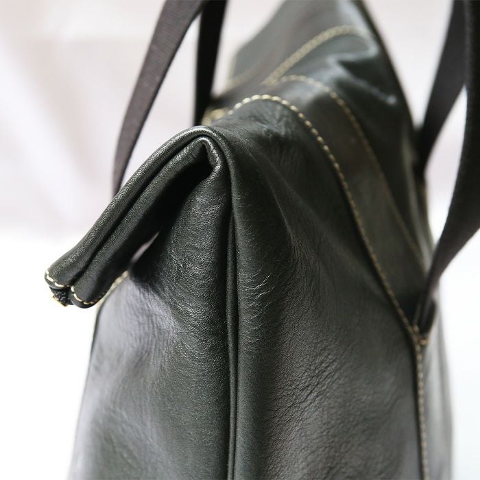 薄手のソフトレザーで仕立てたファスナー開封のかぶせトートバッグ。鞄の大きさや内容量に対して軽量で、鞄本体に過度な負荷がかからないよう、テープハンドルが鞄を包み込むように計算されて取り付けられています。