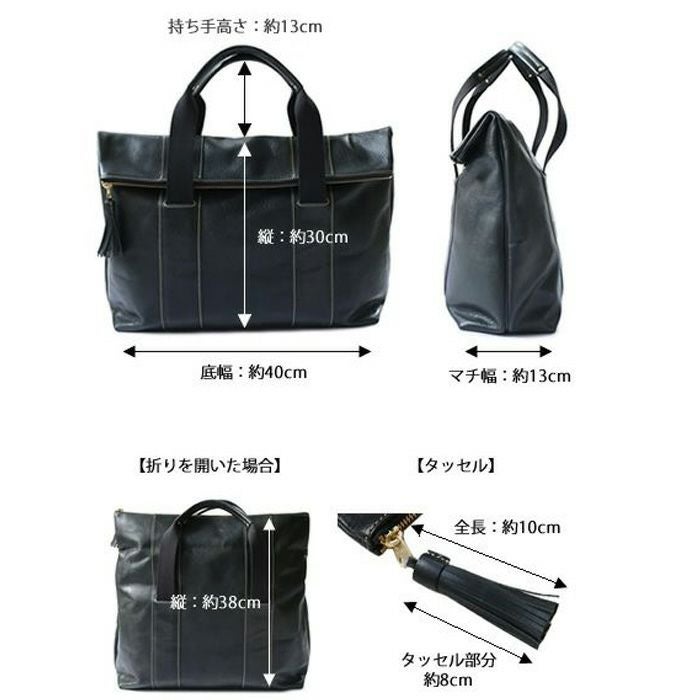 前面 カジュアルからビジネスまで、幅広いファッションに対応できるトートバッグ。薄手のソフトレザーなので、見た目ほど重さを感じない所もメリット。