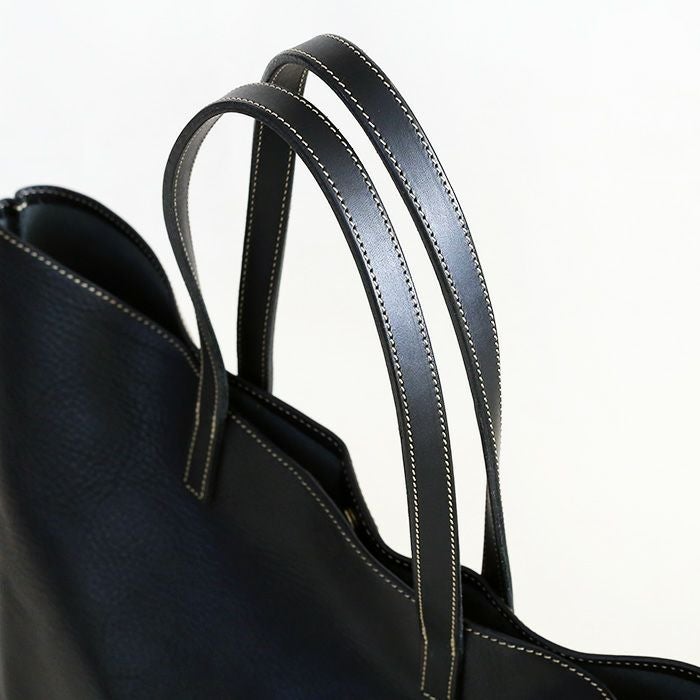 ON/OFF兼用で使える本体サイズにサイズアップし、重たい荷物を入れたとしても底面の型崩れが起きない様、メンズモデルは底板底鋲を初期搭載。持ち手はスマートな印象を引き立てたる為に細幅に仕様変更しましたが、荷重に耐えうる様、厚革を2枚貼り合わせて強度を高めています。何と言っても、大きさや容量に対して、1kgを切る本体の軽さが魅力の1つです!