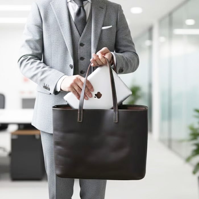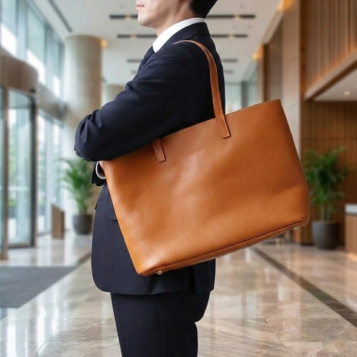 上質な素材感を前面に押し出したスタンダードなトートバッグ。男性がオンオフ両用で使う事を想定した、カジュアル過ぎず、カッチリし過ぎないデザイン。