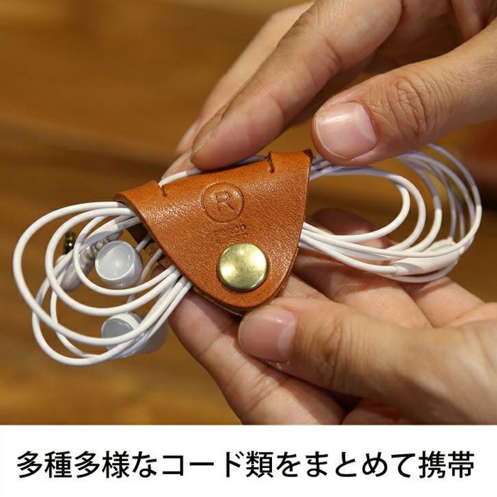 革にコードを差し込んで、束ねてパチン。手早く簡単に収納できて、さらに見た目にも美しい、実用性と機能美を兼ね備えた本革アイテムです。