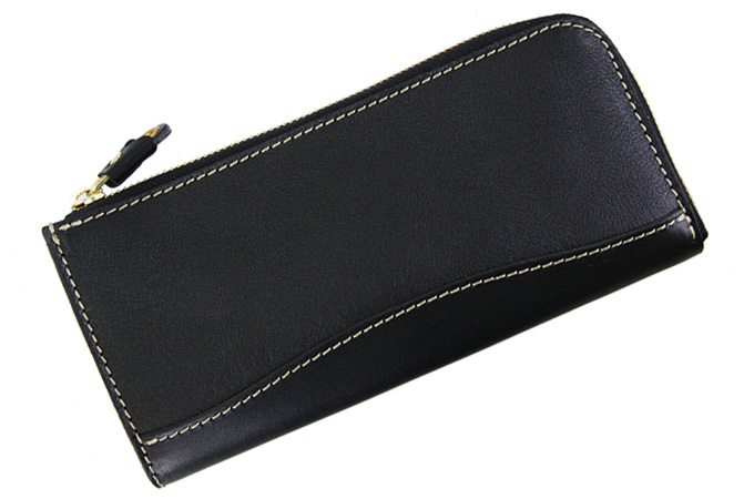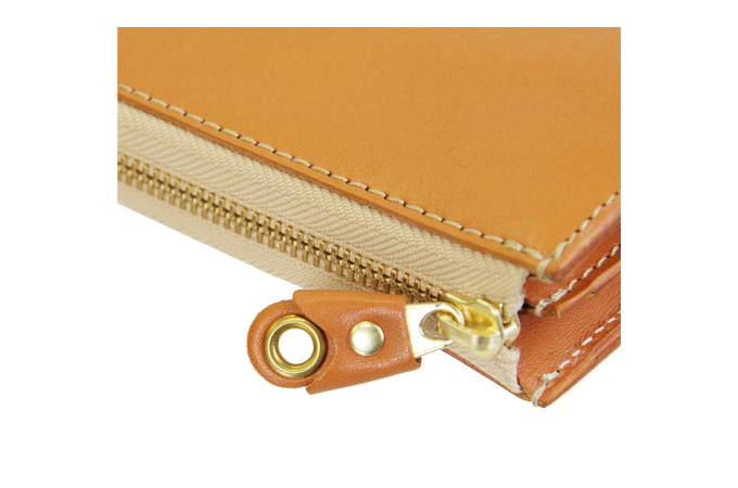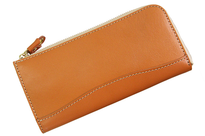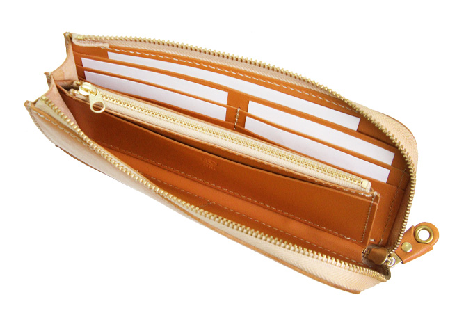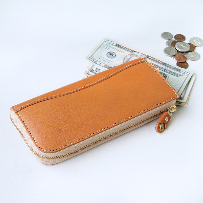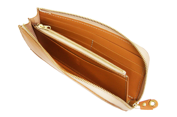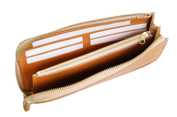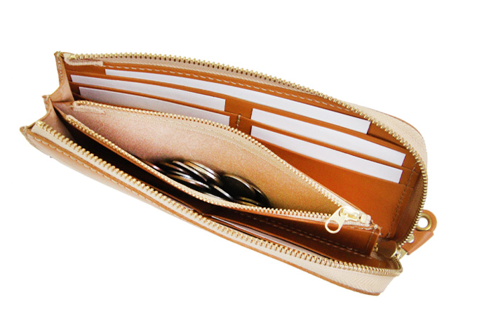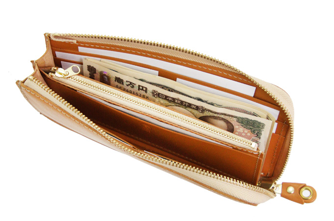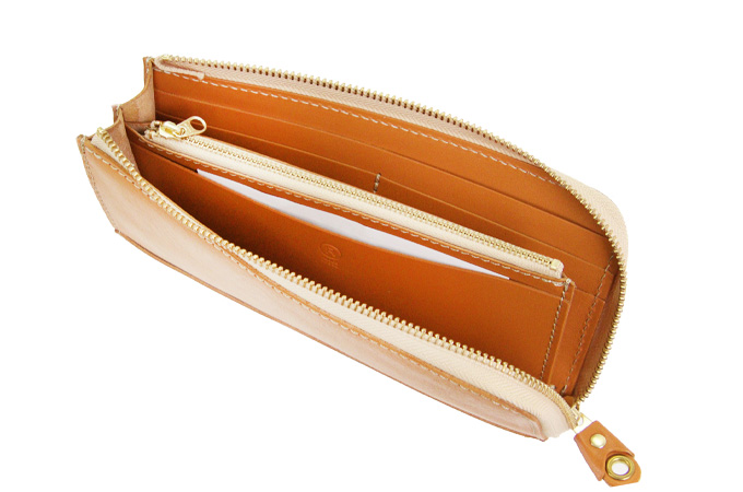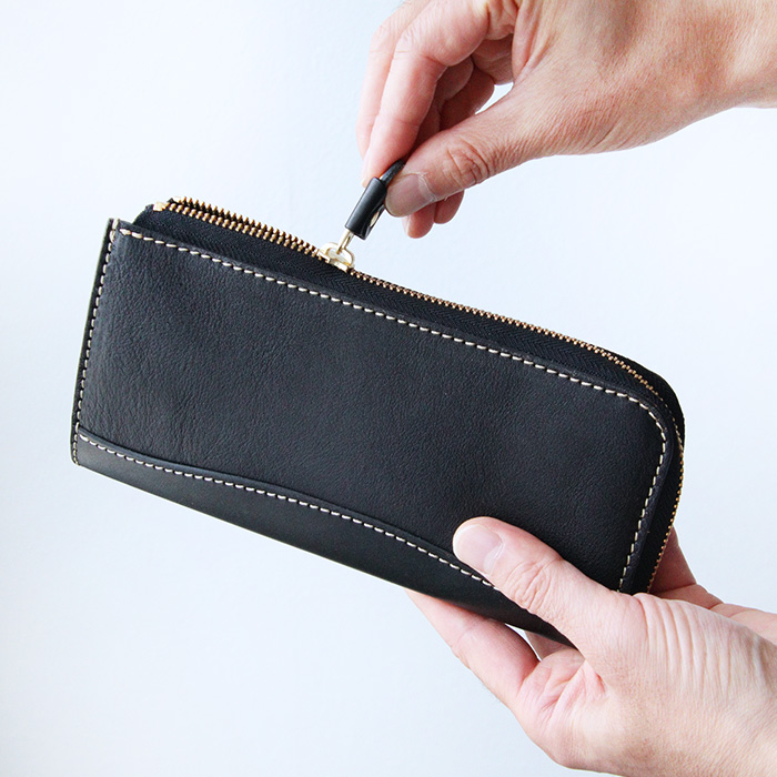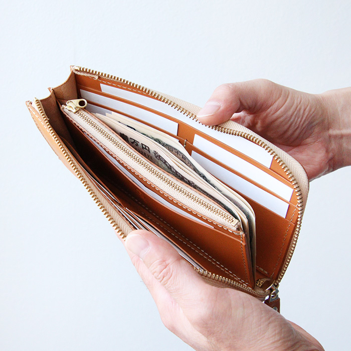 L字タイプは見開きが広く、お札の取り出しがしやすいのが◎。小銭入れにもファスナーを取り付けて滑落しないように仕立てています。