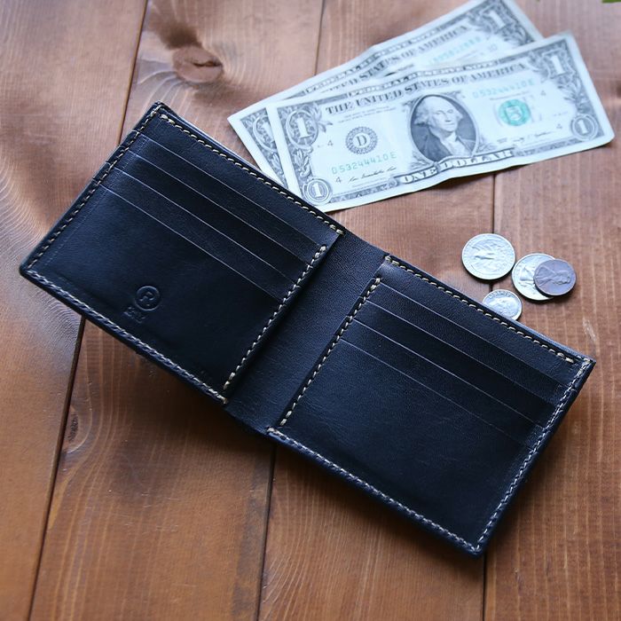 小銭入れを表面に設計することで、札入れ側のカード段も充実させることができています。定番だからこそ下手にデザインせず機能性を重視した逸品です。