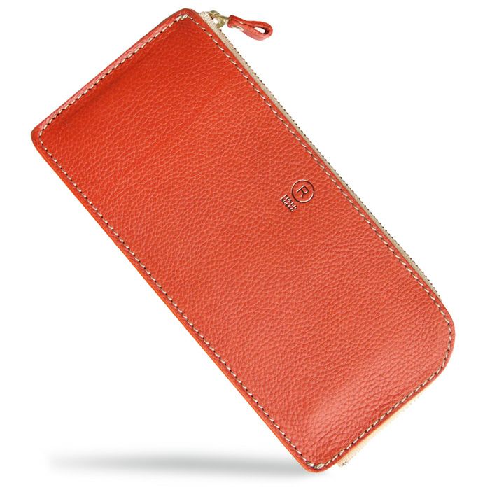 前面 薄くてすっきりした外観。中央にはピンクゴールドのポルコロッソ箔押し刻印。