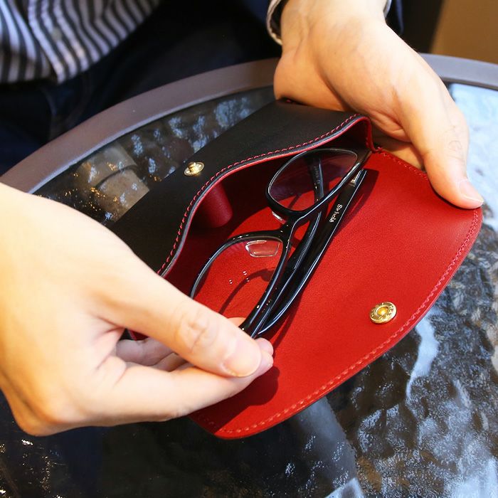 中には凸状レザーが付いており、メガネの鼻部分にフィット。形を崩さずメガネをしっかりと固定します。 大切なメガネをしっかり守り、安心して収納できます。