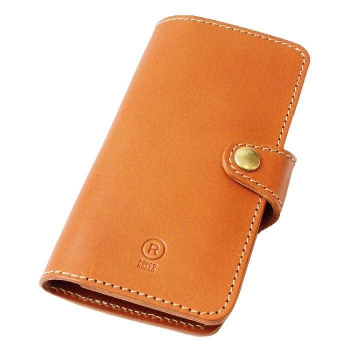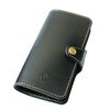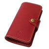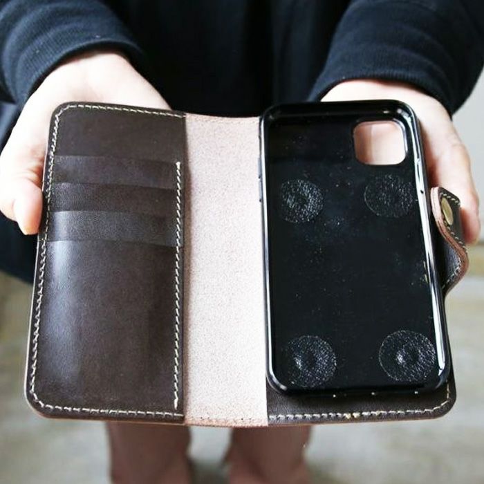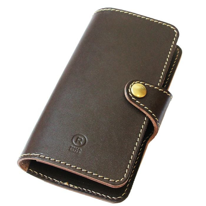 手帳タイプのiPhoneケース。開閉はホック式です。ハードレザーのツヤ感が映えるシンプルデザイン。