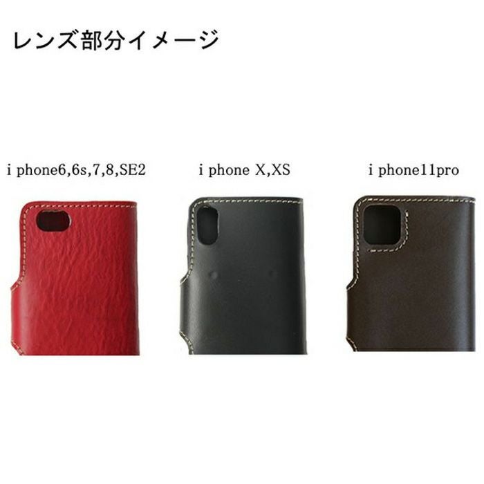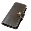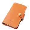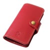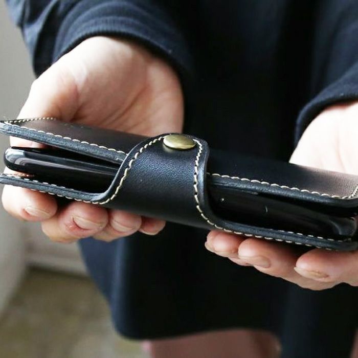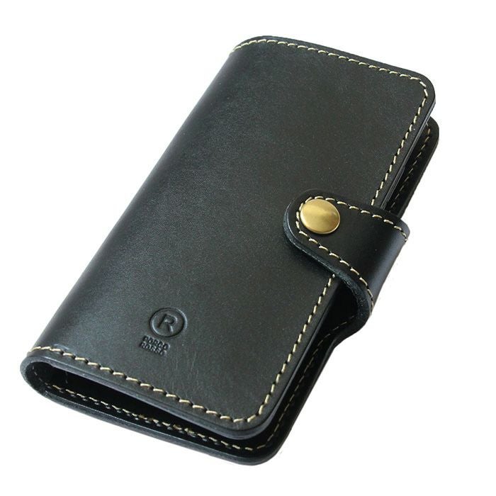 手帳タイプのiPhoneケース。開閉はホック式です。ハードレザーのツヤ感が映えるシンプルデザイン。