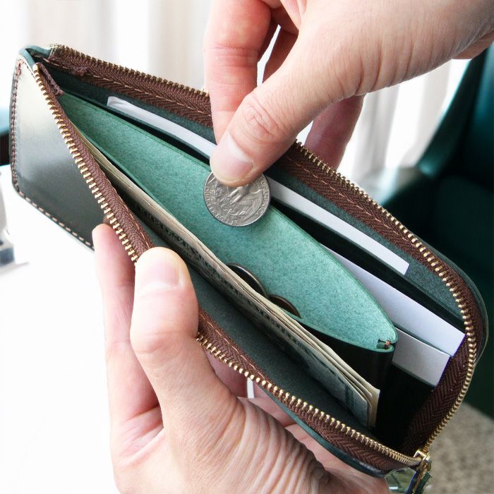 薄マチL字財布に比べて高さを5mm短くしたことで、よりスマートな印象になりました。 スマートになってもしっかりとお札が収まる・筒状の小銭入れから小銭が飛び出さない、等こだわって設計し、