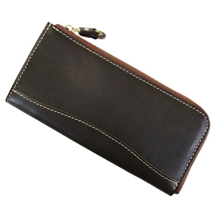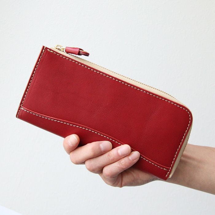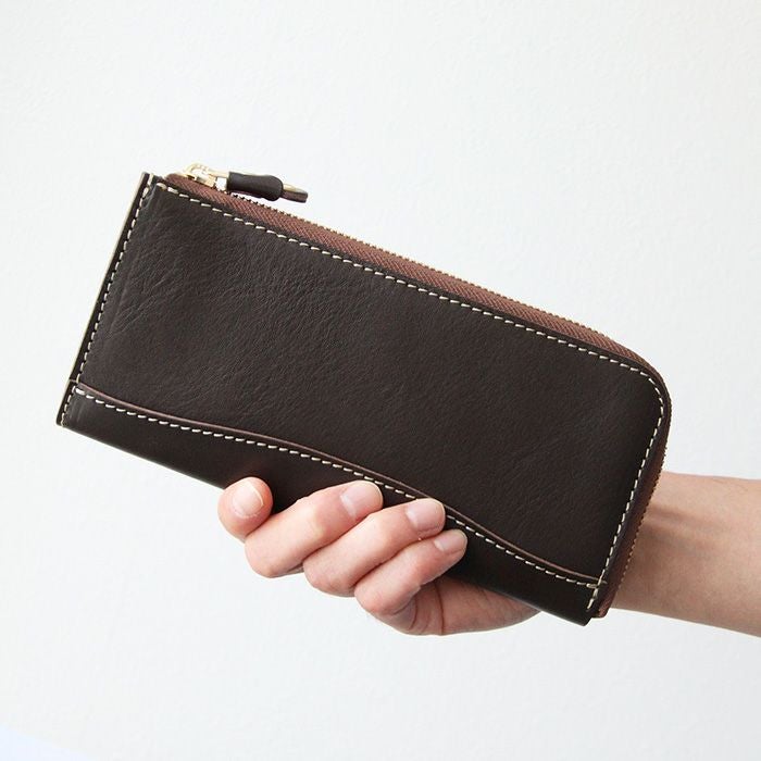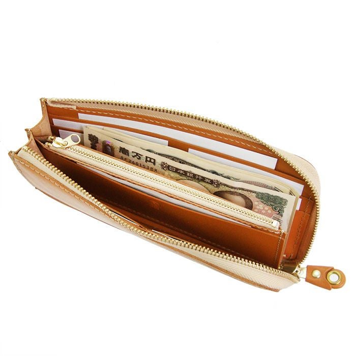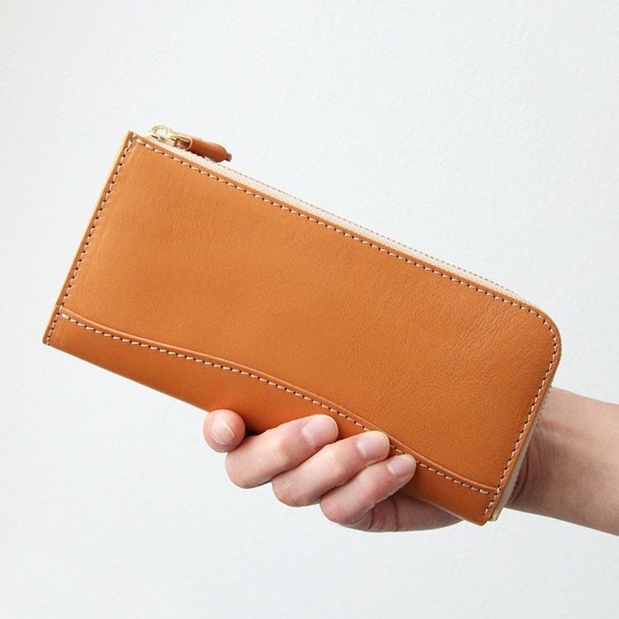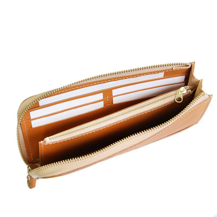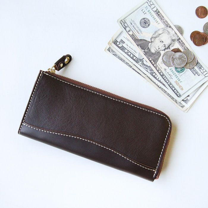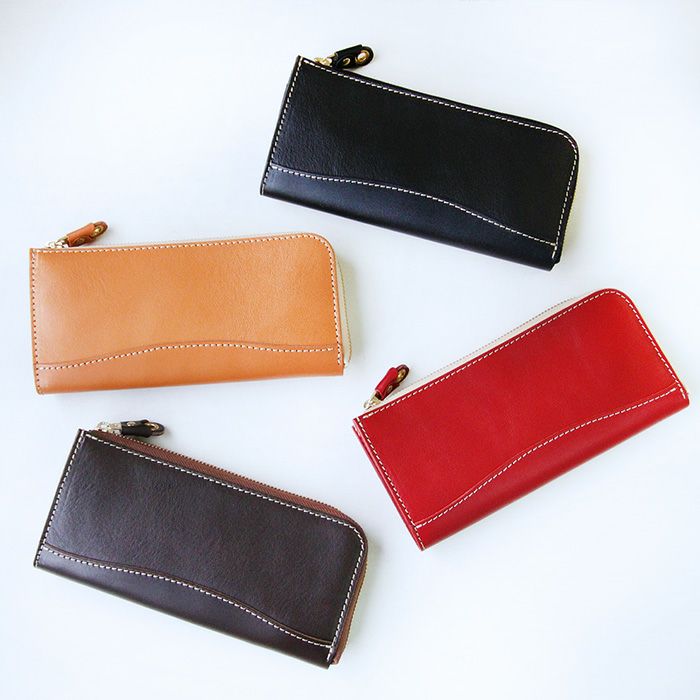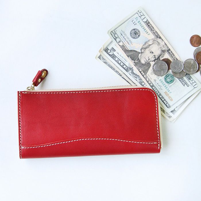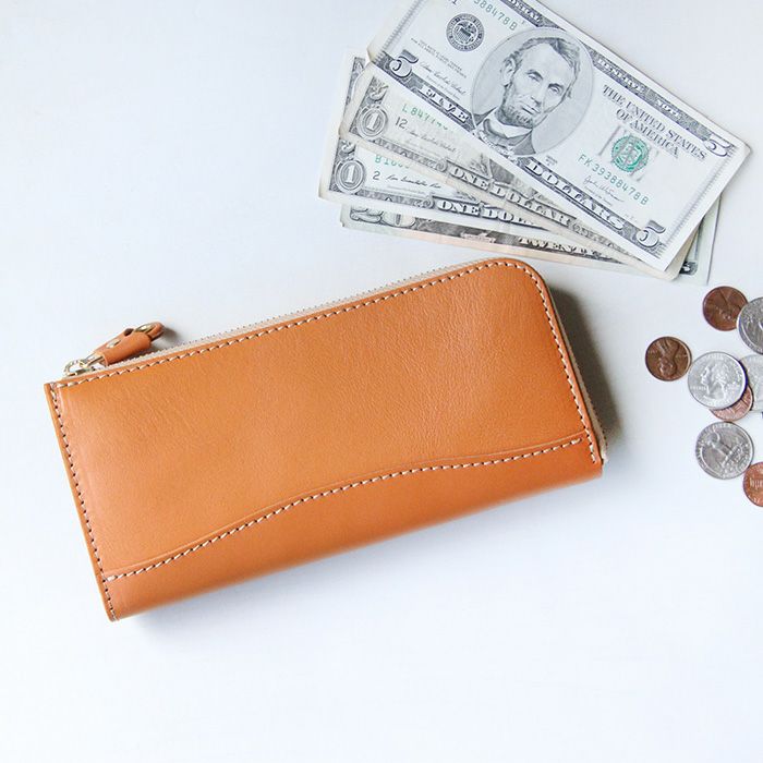 L字タイプは見開きが広く、お札の取り出しがしやすいのが◎。小銭入れにもファスナーを取り付けて滑落しないように仕立てています。