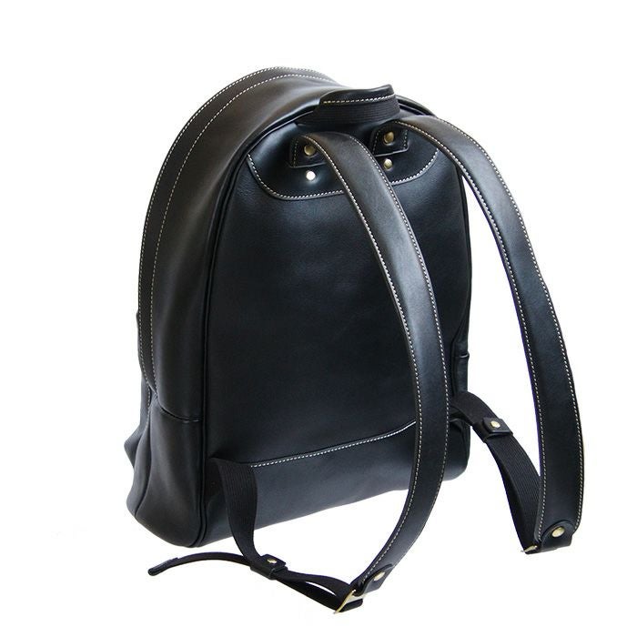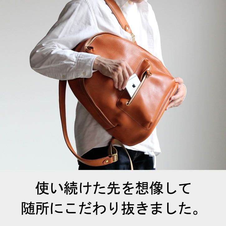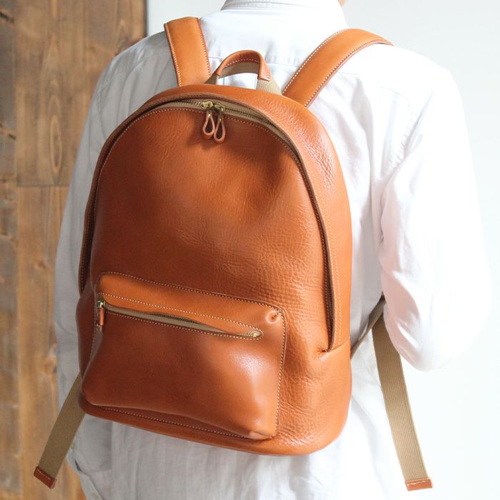 街歩きには十分すぎる程の内容量、背負った際の肩へのフィット感はさることながら、使い続けた先を想像しながらパターンを引き、経年変化でくったりと柔らかくなってほしいパーツと永く愛用していても丈夫であってほしいパーツで革の種類・厚みを使い分けて仕立て上げました。