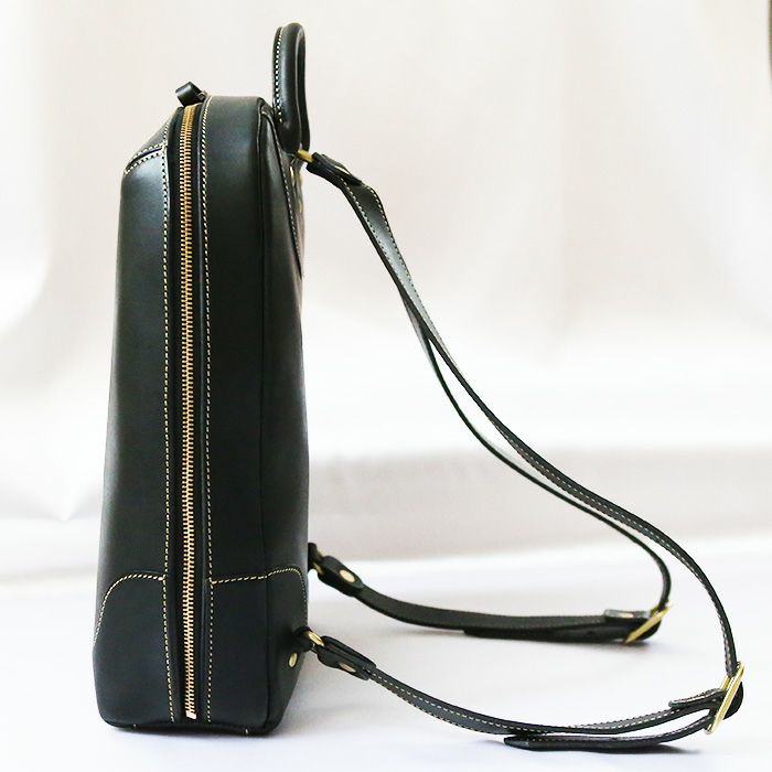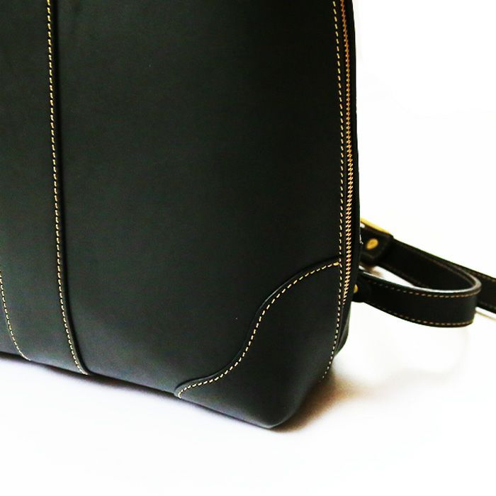 ハードレザーを使用しており、美しいラウンドフォルムが目を惹きます。背中に綺麗に納まる縦長シルエット。フルオープンながらストップタイプのファスナーを使用し、好きな位置でファスナーをとめることができるので出入れする荷物に応じて開封の具合が調整できます。リュックストラップは24mm幅。