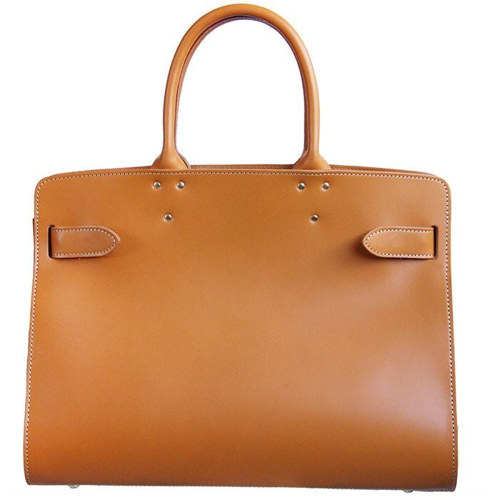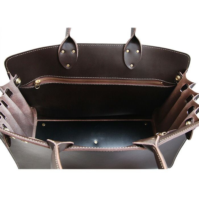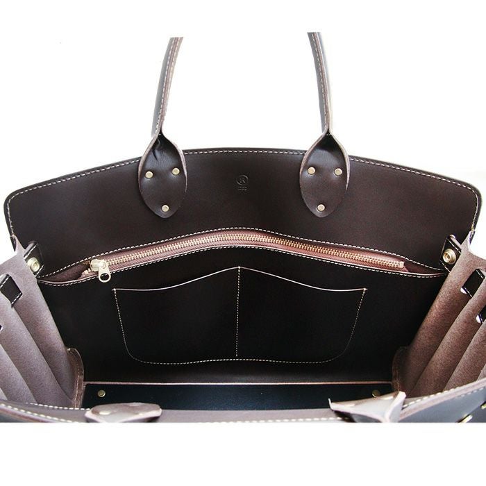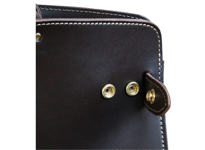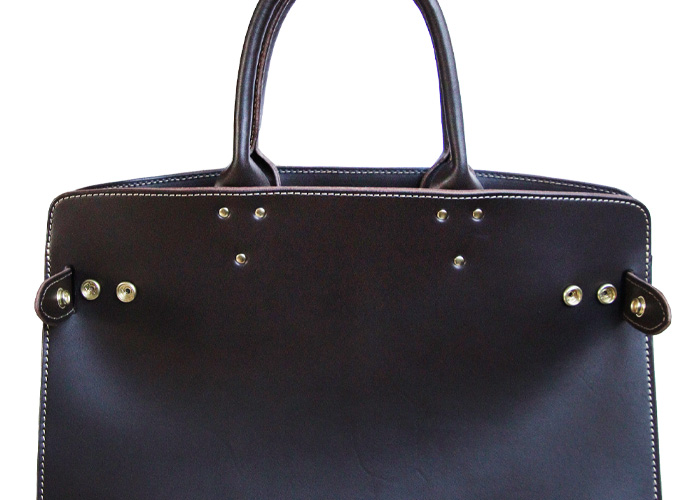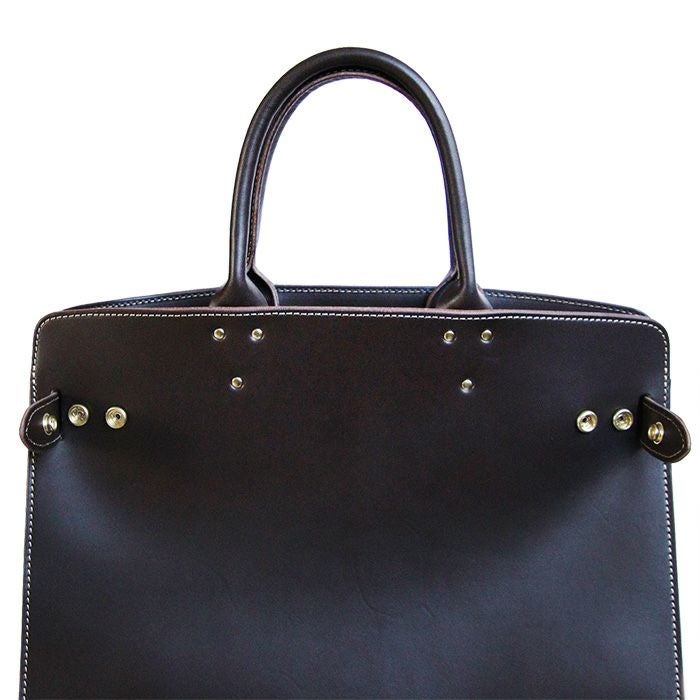 持ち手部分には芯を入れ、しっかりと荷物の重さに耐えることのできる三点のカシメがアクセント。