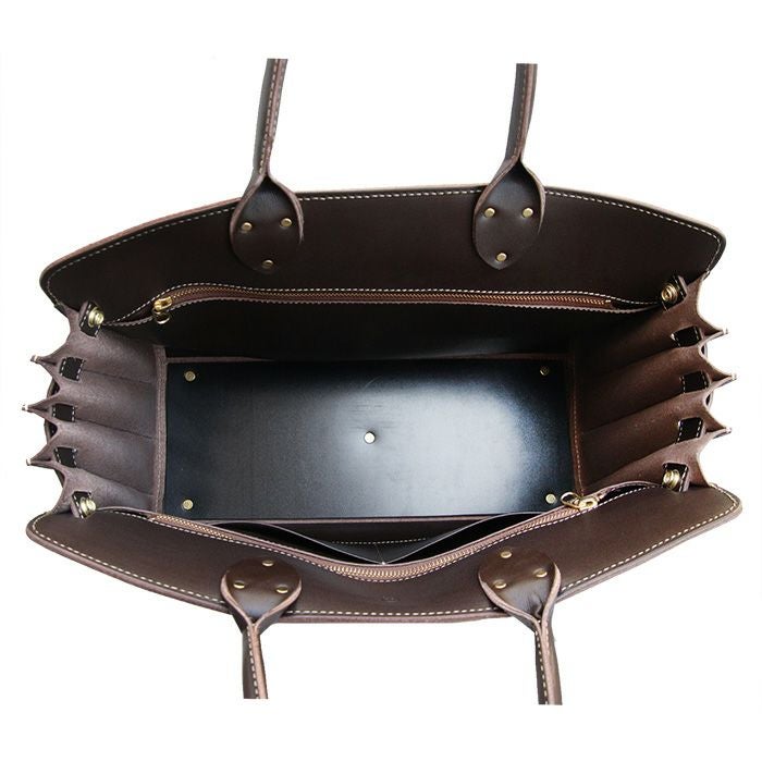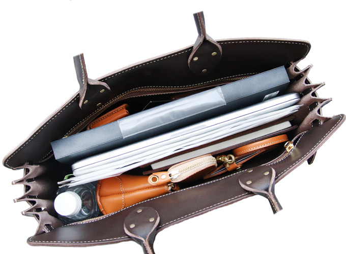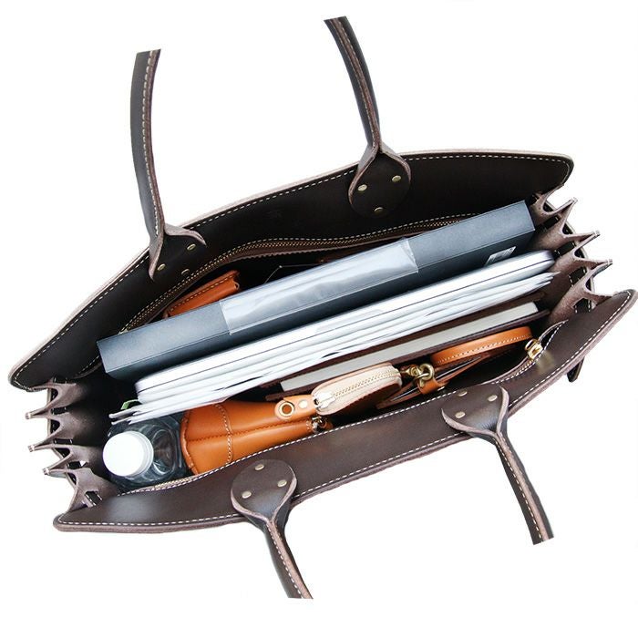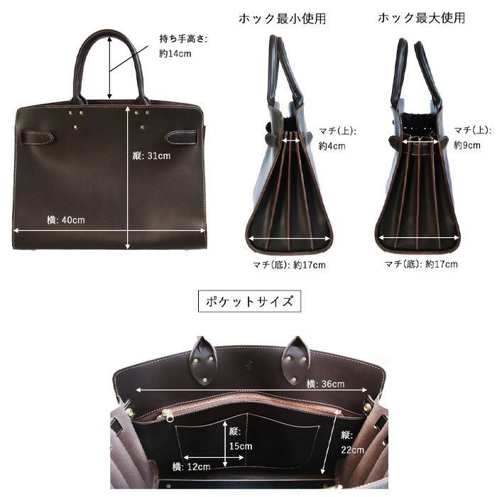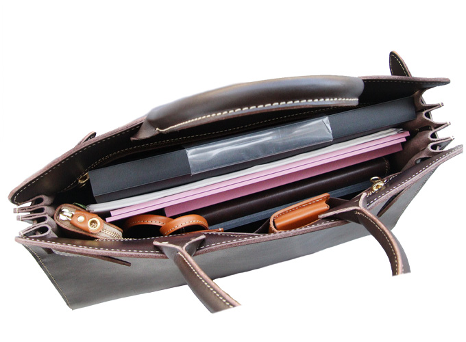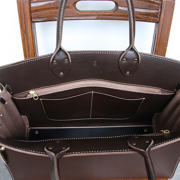 マチが広く、普段のお仕事道具に加えて水筒やお弁当など身の回りの物も収納できるサイズ感に仕立てています。