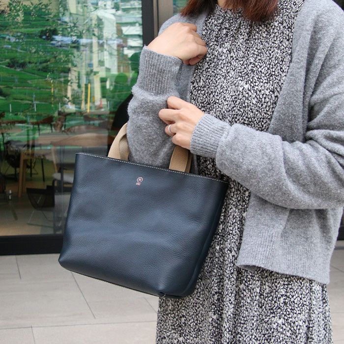 前面 シンプルデザインのトートバッグ。前面にはピンクゴールドのPORCO ROSSO刻印を施しています。