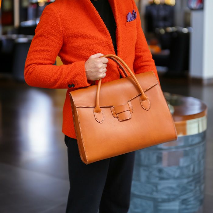 手にするとどっしりと革の重厚な感触が、得も言われぬ感傷を呼び起こし、使い込んだ末に、味わい深くなったこの鞄の何年後かの姿を想像できるようだ。