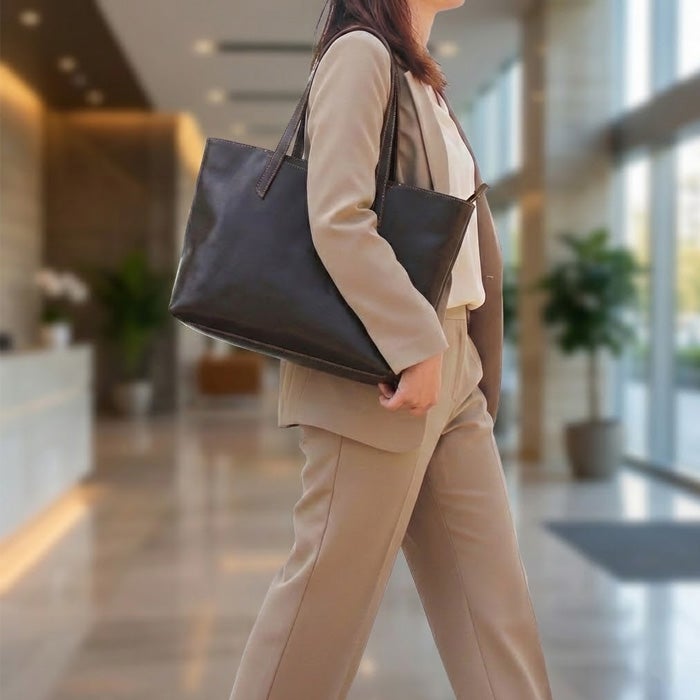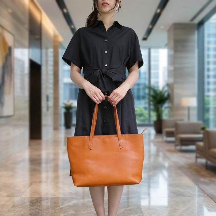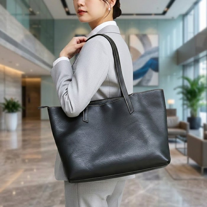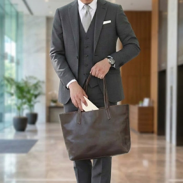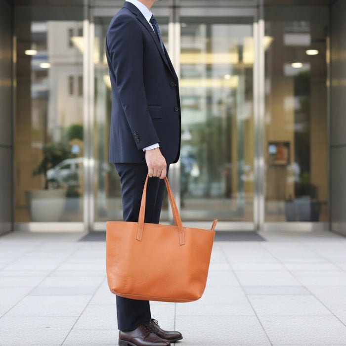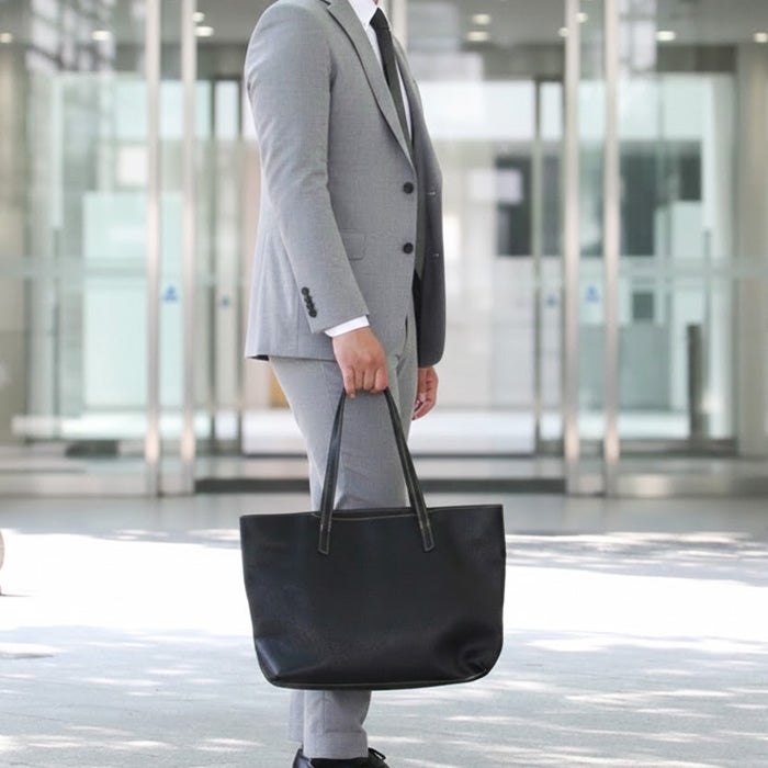 ビジネスユースにもタウンユースにも合わせやすいファスナータイプのトートバッグ。