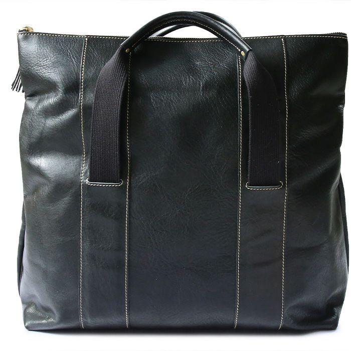 薄手のソフトレザーで仕立てたファスナー開封のかぶせトートバッグ。鞄の大きさや内容量に対して軽量で、鞄本体に過度な負荷がかからないよう、テープハンドルが鞄を包み込むように計算されて取り付けられています。