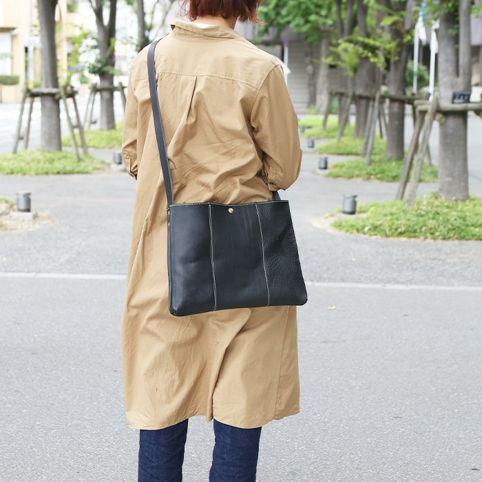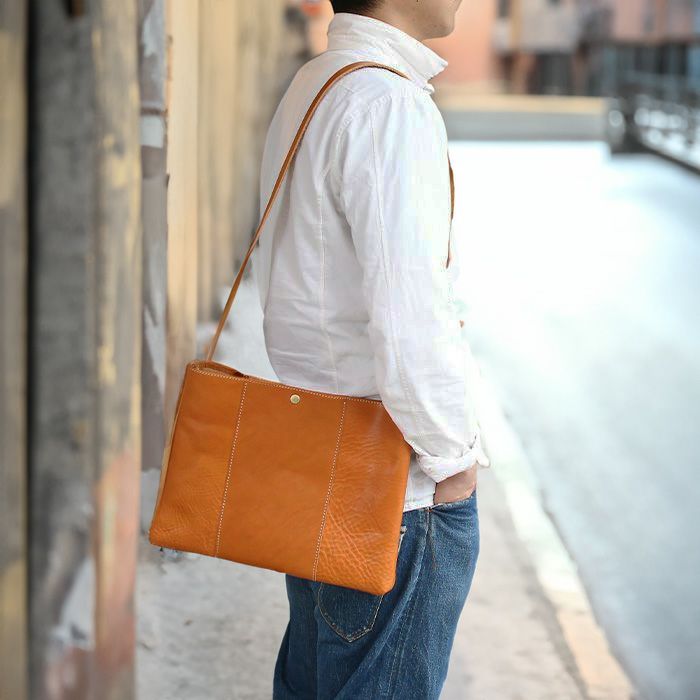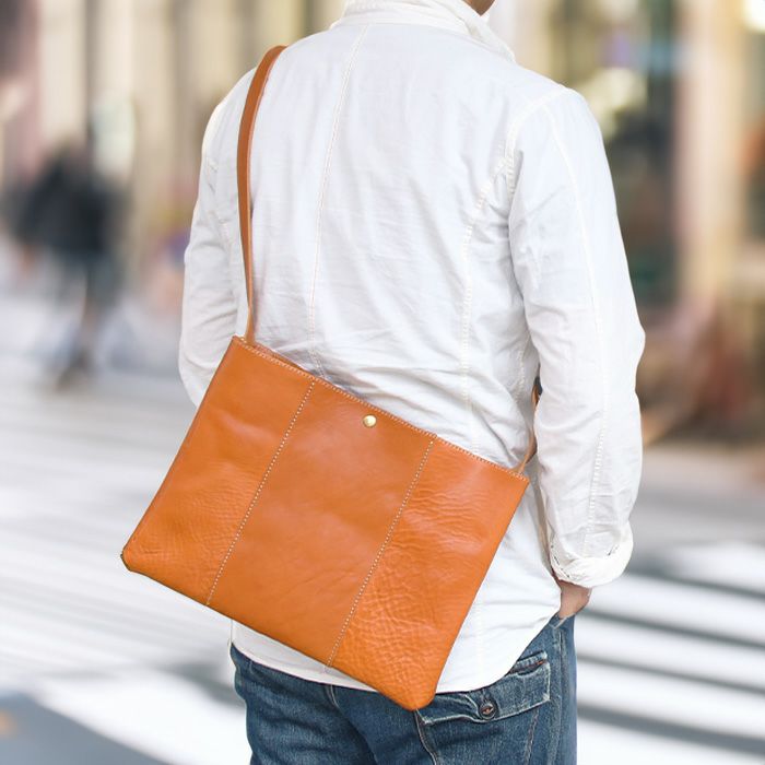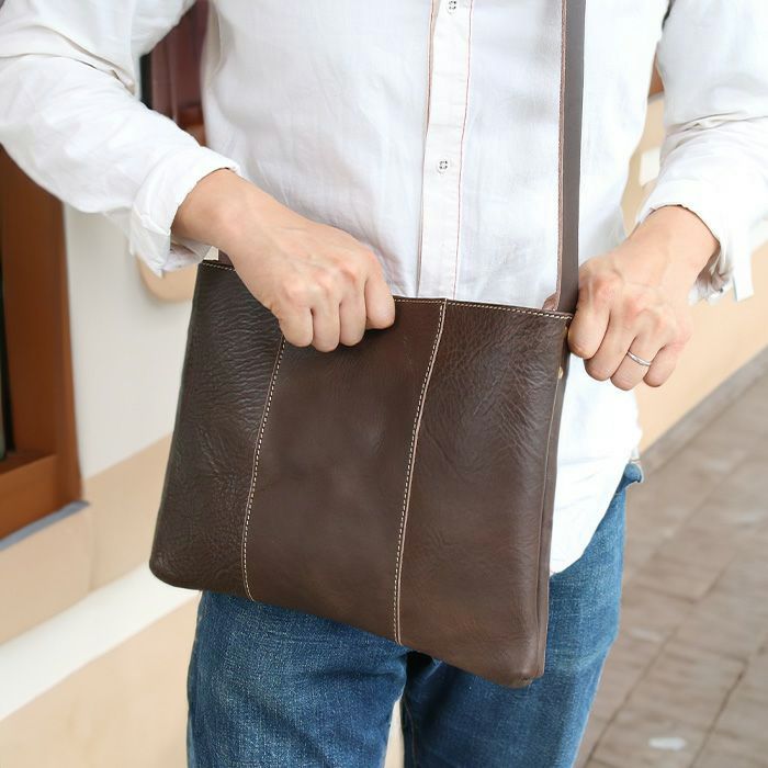 マチ幅は薄めで、大人っぽいスマート&カジュアル感が充実。さらに見かけ以上の収納力があり、バッグ本体も軽量に仕上がっているので、街歩きを邪魔することなく、オフタイムの良いお供として活躍してくれること間違いなし。タフに使い込んで、自分らしい革に育てたくなる一品です。
