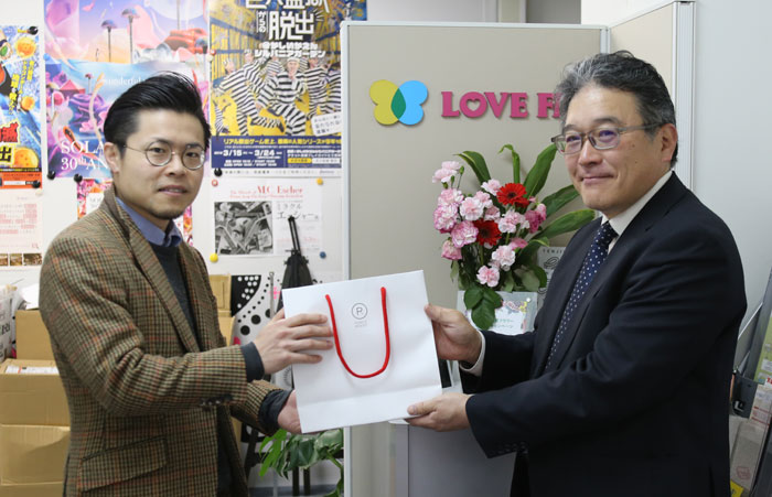 弊社の職人(写真左)からLOVE FM 様へ手渡し。