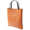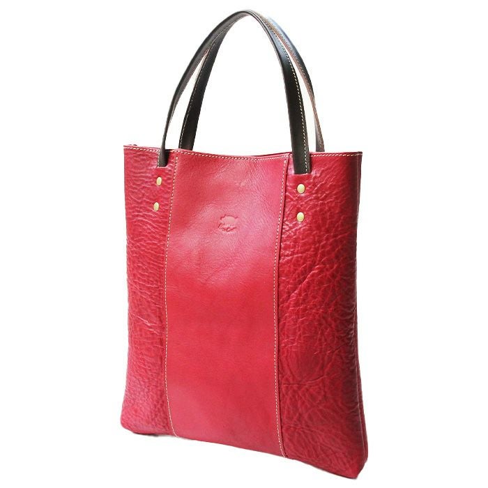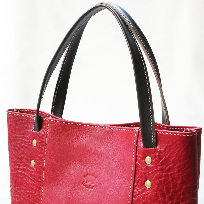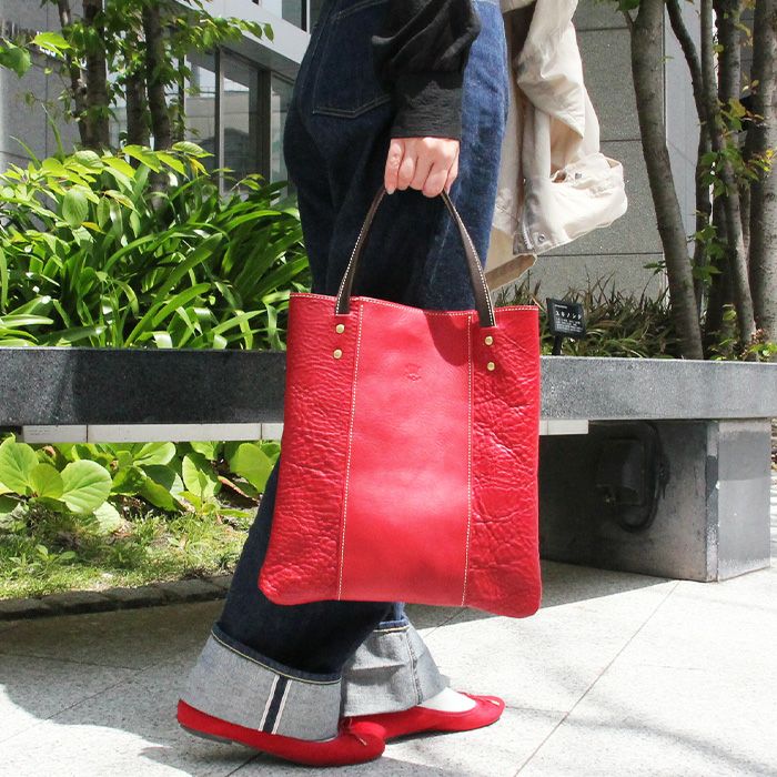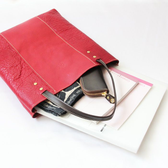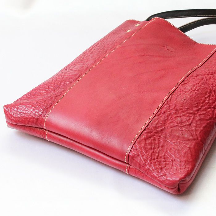 三枚のレザーを組み合わせて、カジュアルな雰囲気に仕立てたトートバッグ。