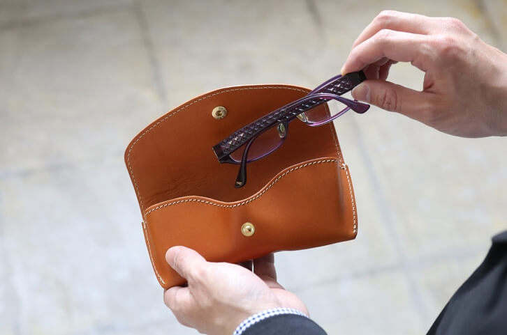 すっきりとシンプルな印象の前面。フラップの形状を剣先タイプにし、指の引っ掛かりが良い様に仕立てています。また、内側も総裏貼り仕様で高級感たっぷり。メガネをしっかりと内部で固定するようなしかけも。男女ともにご愛用いただけるベーシックなデザインです。