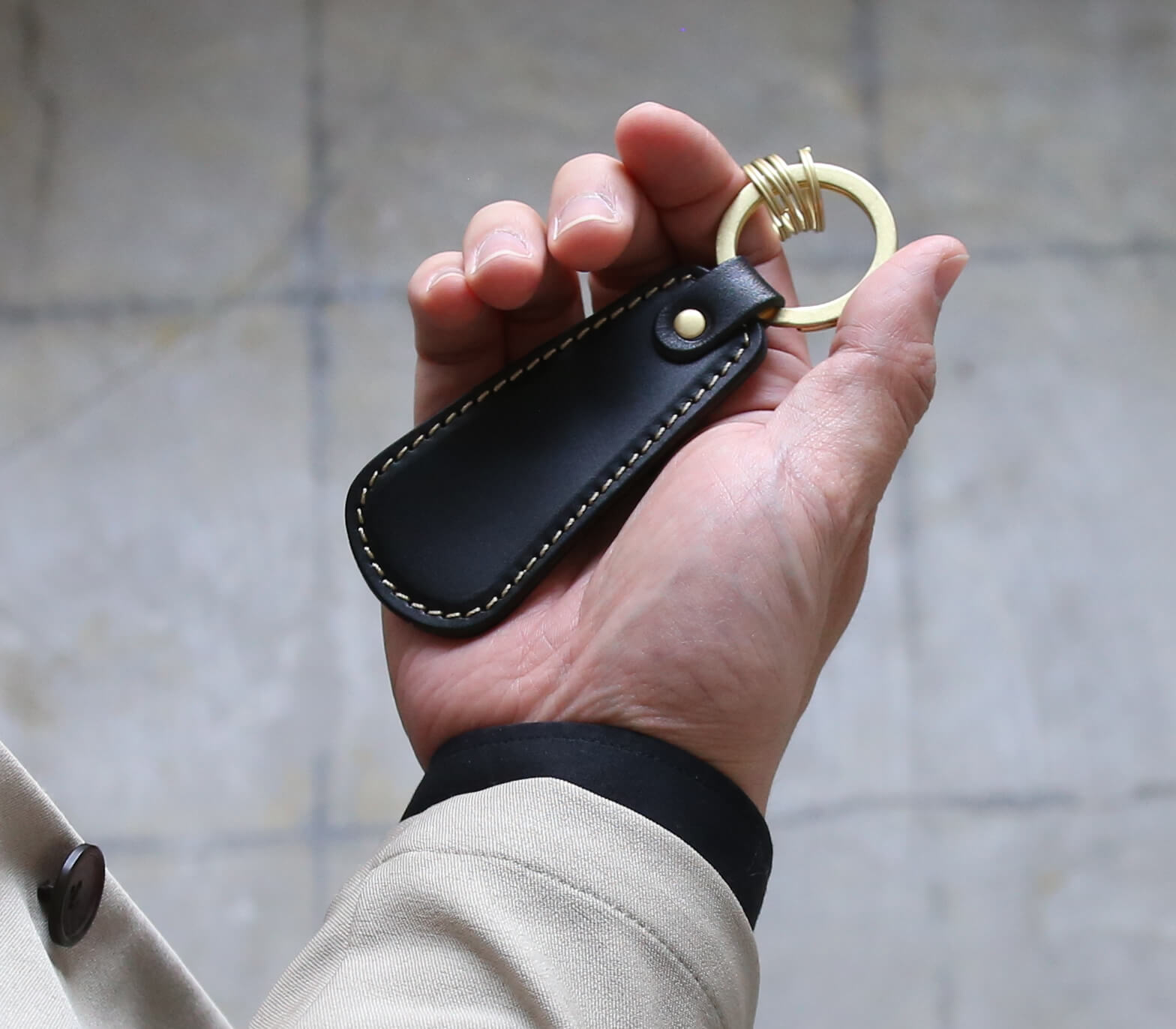 上質なオリジナルレザーを用いて丁寧に仕上げたことで、無機質になりがちな靴べらに温かみをプラスしました。4つのダブルリングを備えているため、キーケースにつけたり、キーホルダーとして鍵をまとめるアイテムとしても活躍。さっと取り出してさりげなく、かつスマートに使うことができます。